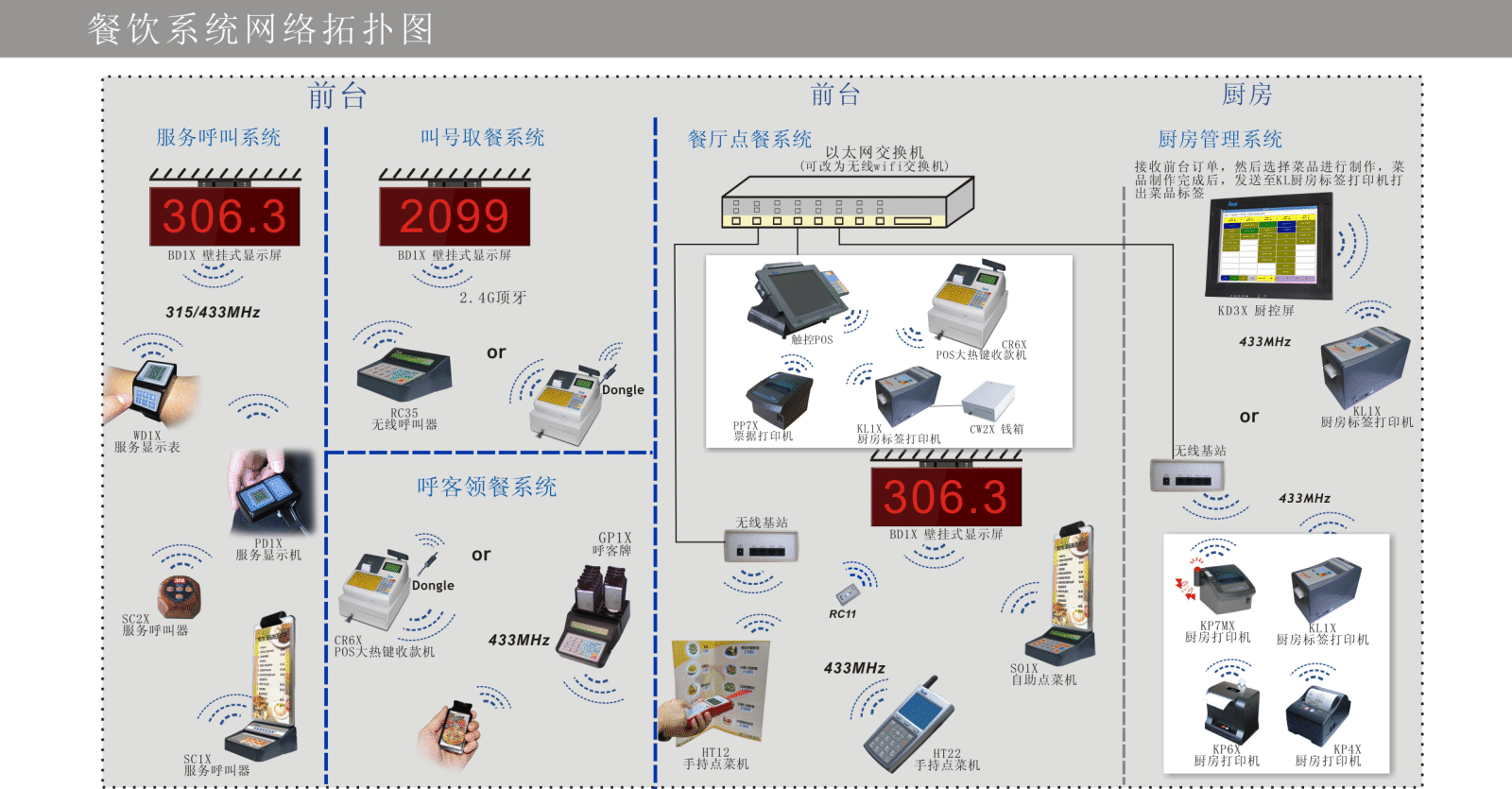 ※ 推荐以无线方式通讯(433MHz、WIFI)的厨房打印机,能防止油烟污染通讯金属接点造成的通讯不良。